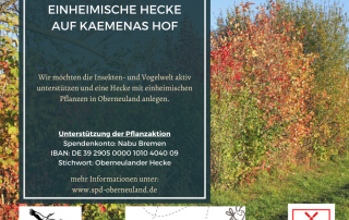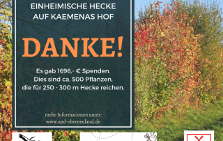 Derik Eicke2021-03-07T11:56:51+02:00DANKE für die tolle Unterstützung bei der Spendenaktion für eine einheimische Hecke in Oberneuland. Es sind 1696,- € gespendet worden. Dies ist ein tolles Ergebnis. Die Fachleute haben sich nun beraten, welche Gehölze aufgrund der Bodenverhältnisse bei Hajo Kaemena gepflanzt werden sollen. Des Weiteren haben sie besprochen, dass die Pflanzen [...]